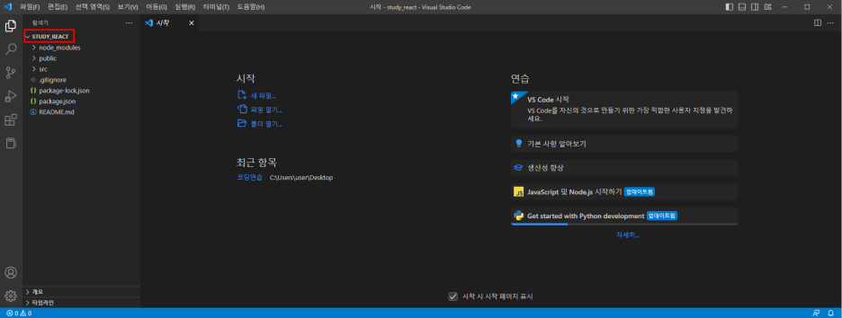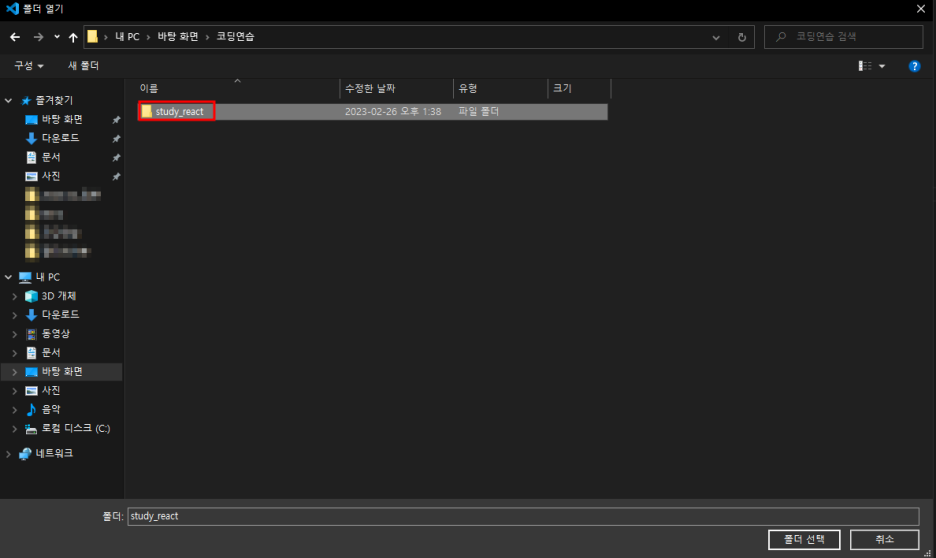파일 > 폴더열기 클릭 후, 아까 만들었던 폴더를 열면 됩니다. (저는 study_react 폴더를 열었습니다.)