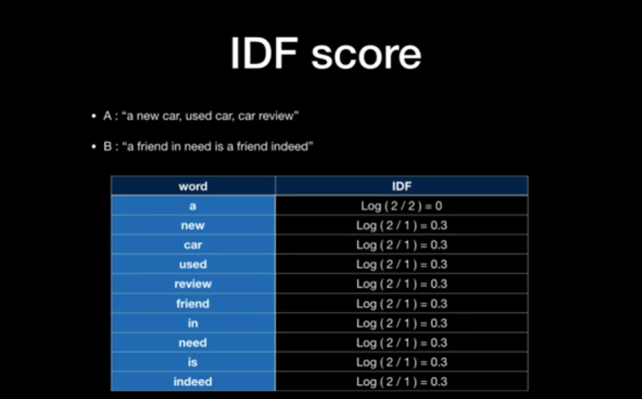 → 문서 Corpus(말뭉치)에 모두 포함된 단어는 흔히 등장하는 단어로, 의미가 크지 않다.