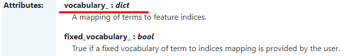 . vocabulary_: 입력된 단어와 고유 인덱스를 볼 수 있다.