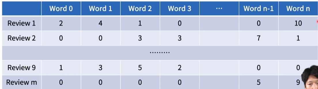 ex) (Review 1, Word 0) = 2 → Review 1에 Word 0은 2번 등장한다.
